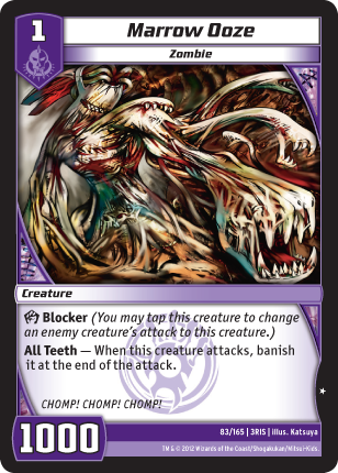 Card Text: | Blocker (You may tap this creature to change an enemy creature's attack to this creature.) All Teeth - When this creature attacks, banish it at the end of the attack. |