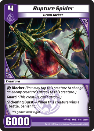 | Card Text: | Blocker (You may tap this creature to change an enemy creature's attack to this creature.) Guard (This creature can't attack.) Sickening Burst - When this creature wins a battle, banish it. |