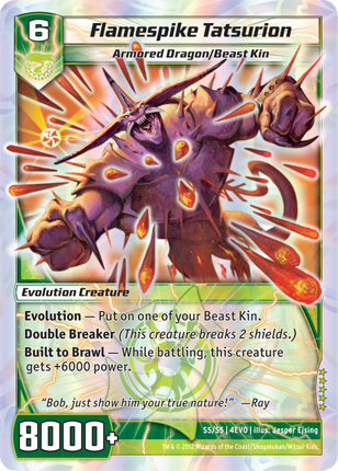 Card Text: | Evolution - Put on one of your Beast Kin. Double Breaker (This creature breaks 2 shields.) Built to Brawl - While battling, this creature gets +6000 power. |
