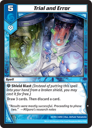 Card Text: | Shield Blast (Instead of putting this spell into your hand from a broken shield, you may cast it for free.) Draw three cards. Then discard one card. |
