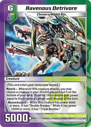| Card Text: | (This card enters you mana zone tapped.) Munch - Whenever this creature attacks, you may choose a creature in your discard pile and put it on the bottom of your deck. If you do, this creature gets power equal to that creature's power until the end of the turn. Necrocharged - While this creature has power 6000 or more, it has "Double Breaker." While it has power 12000 or more, it has "Triple Breaker." |
