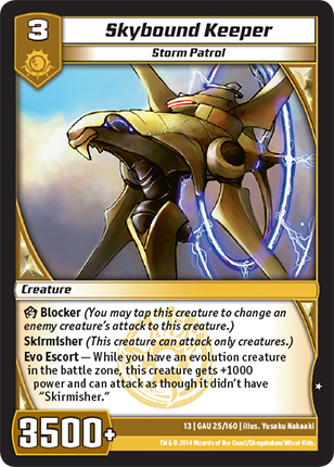 Card Text: | Blocker (You may tap this creature to change an enemy creature's attack to this creature.) Skirmisher (This creature can attack only creatures.) Evo Escort - While you have an evolution creature in the battle zone, this creature gets +1000 power and can attack as though it didn't have "Skirmisher." |