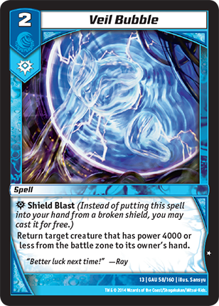 | Card Text: | Shield Blast (Instead of putting this spell into your hand from a broken shield, you may cast it for free.) Return target creature that has power 4000 or less from the battle zone to its owner's hand. |