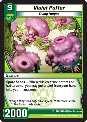 Card Text: | Spore Seeds - When this creature enters the battle zone, you may put a card from your hand into your mana zone. |