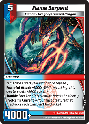 Card Text: | (This card enters your mana zone tapped.) Powerful Attack +3000 (While attacking, this creature gets +3000 power.) Double Breaker (This creature breaks 2 shields.) Volcanic Current - Your first creature that attacks each turn can't be blocked. |