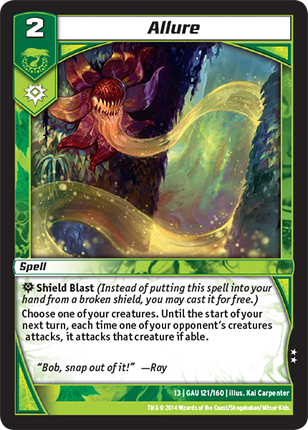 Choose one of your creatures. Until the start of your next turn, each time one of your opponent's creatures attacks, it attacks that creature if able.