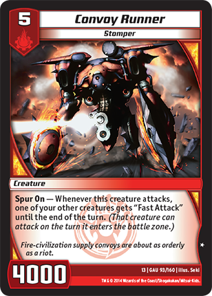 Spur On - Whenever this creature attacks, one of your other creatures gets "Fast Attack" until the end of the turn. (That creature can attack on the turn it enters the battle zone.)