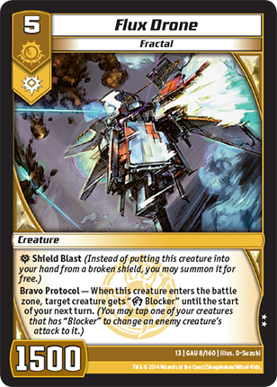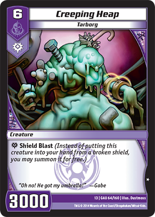 Shield Blast (Instead of putting this creature into your hand from a broken shield, you may summon it for free.)