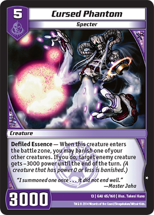 Defiled Essence - When this creature enters the battle zone, you may banish one of your other creatures. If you do, target enemy creature gets -3000 power until the end of the turn. (A creature that has power 0 or less is banished.)