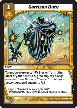 Untap all your creatures. They get "Blocker" until the start of your next turn. (You may tap a creature that has "Blocker" to change an enemy creature's attack to it.)
