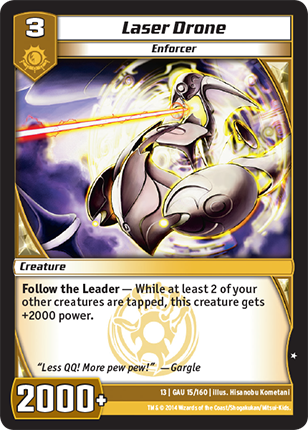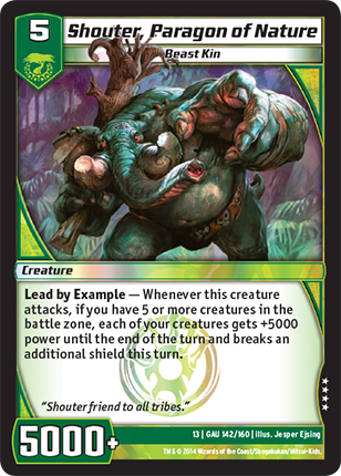 Lead by Example - Whenever this creature attacks, if you have 5 or more creatures in the battle zone, each of your creatures gets +5000 power until the end of the turn and breaks an additional shield this turn.