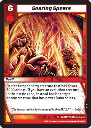Banish target enemy creature that has power 6000 or less. If you have an evolution creature in the battle zone, instead banish target enemy creature that has power 8000 or less.