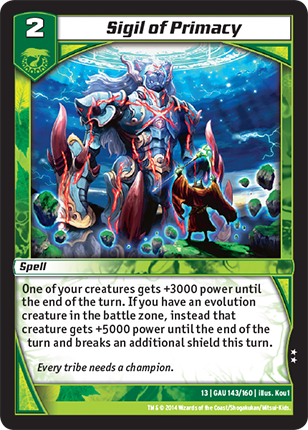 One of your creatures gets +3000 power until the end of the turn. If you have an evolution creature in the battle zone, instead that creature gets +5000 power until the end of the turn and breaks an additional shield this turn.