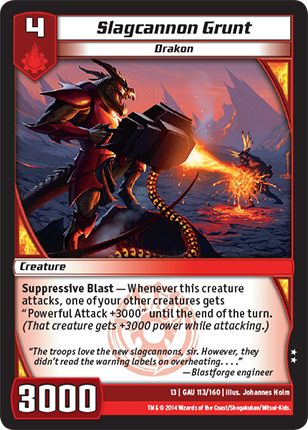 Suppressive Blast - Whenever this creature attacks, one of your other creatures gets +3000 power until the end of the turn.