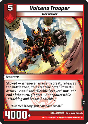 Stoked - Whenever an enemy creature leaves the battle zone, this creature gets "Powerful Attack +2000" and "Double Breaker" until the end of the turn. (It gets +2000 power while attacking and breaks 2 shields.)